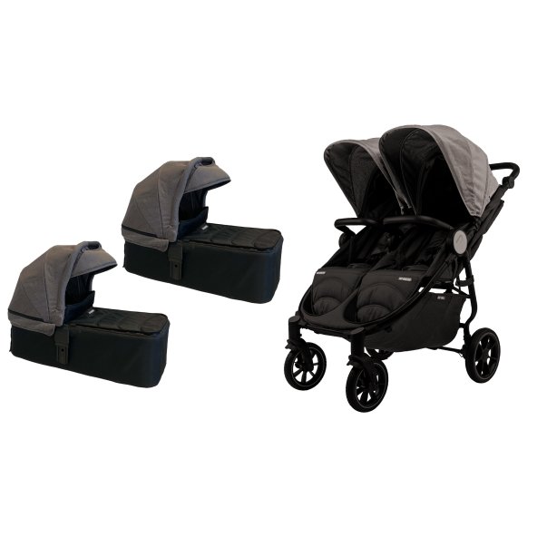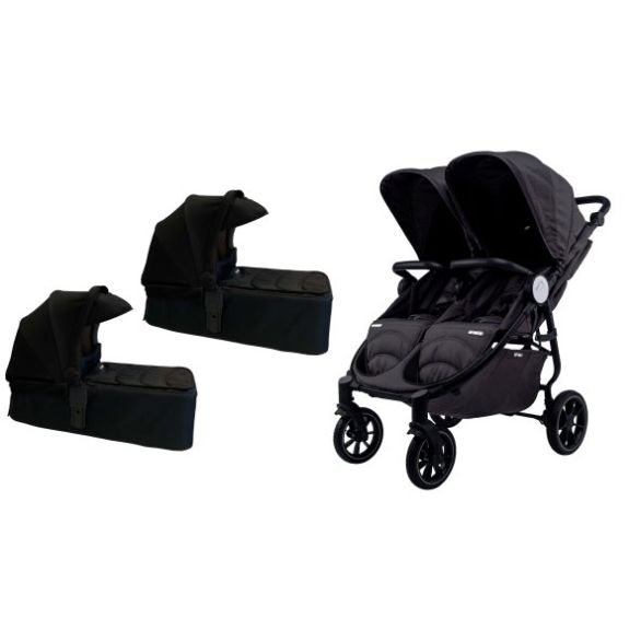 Es cómodo y seguro para los bebés, se puede utilizar desde el nacimiento, ya que los respaldos se reclinan completamente. Cada respaldo se reclina por separado, así que mientras un bebé duerme, el otro puede ir sentado. Las capotas igual que los asientos son separadas.